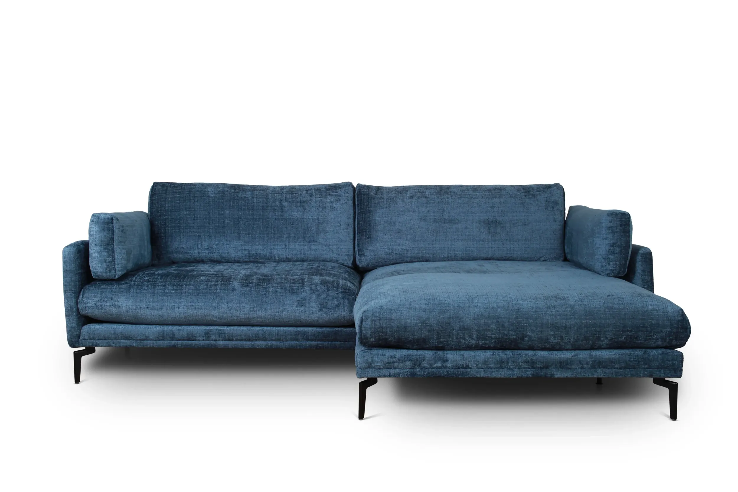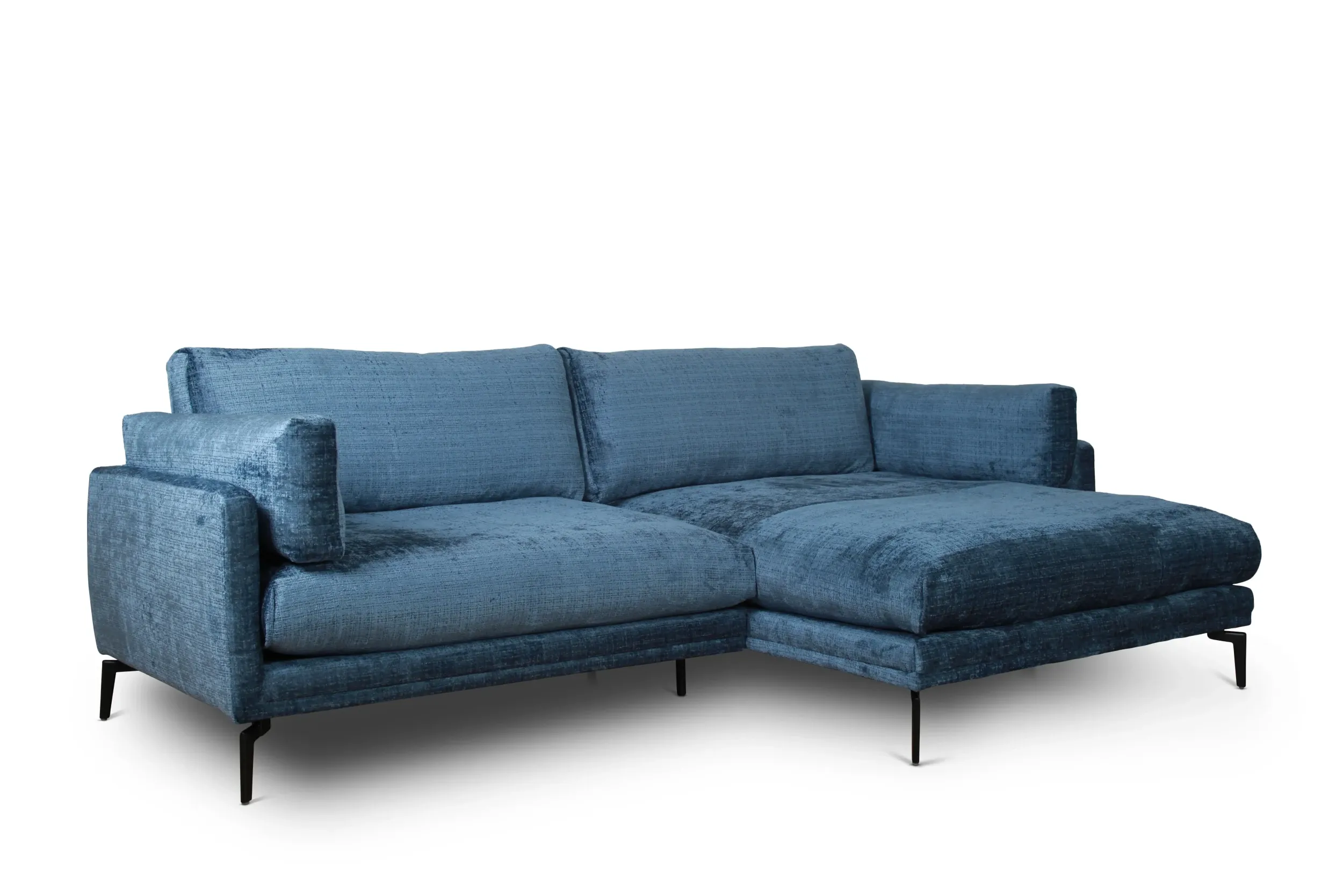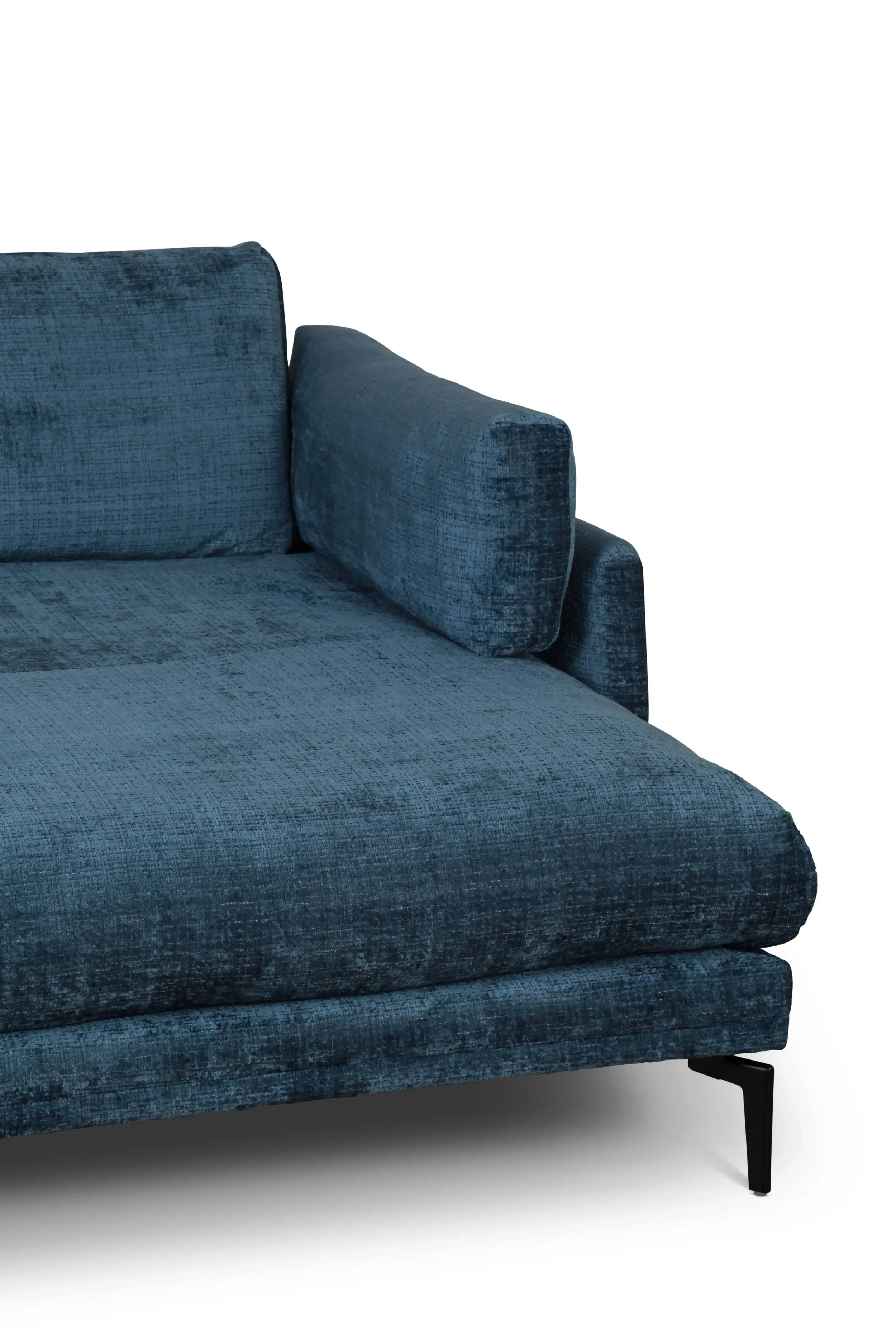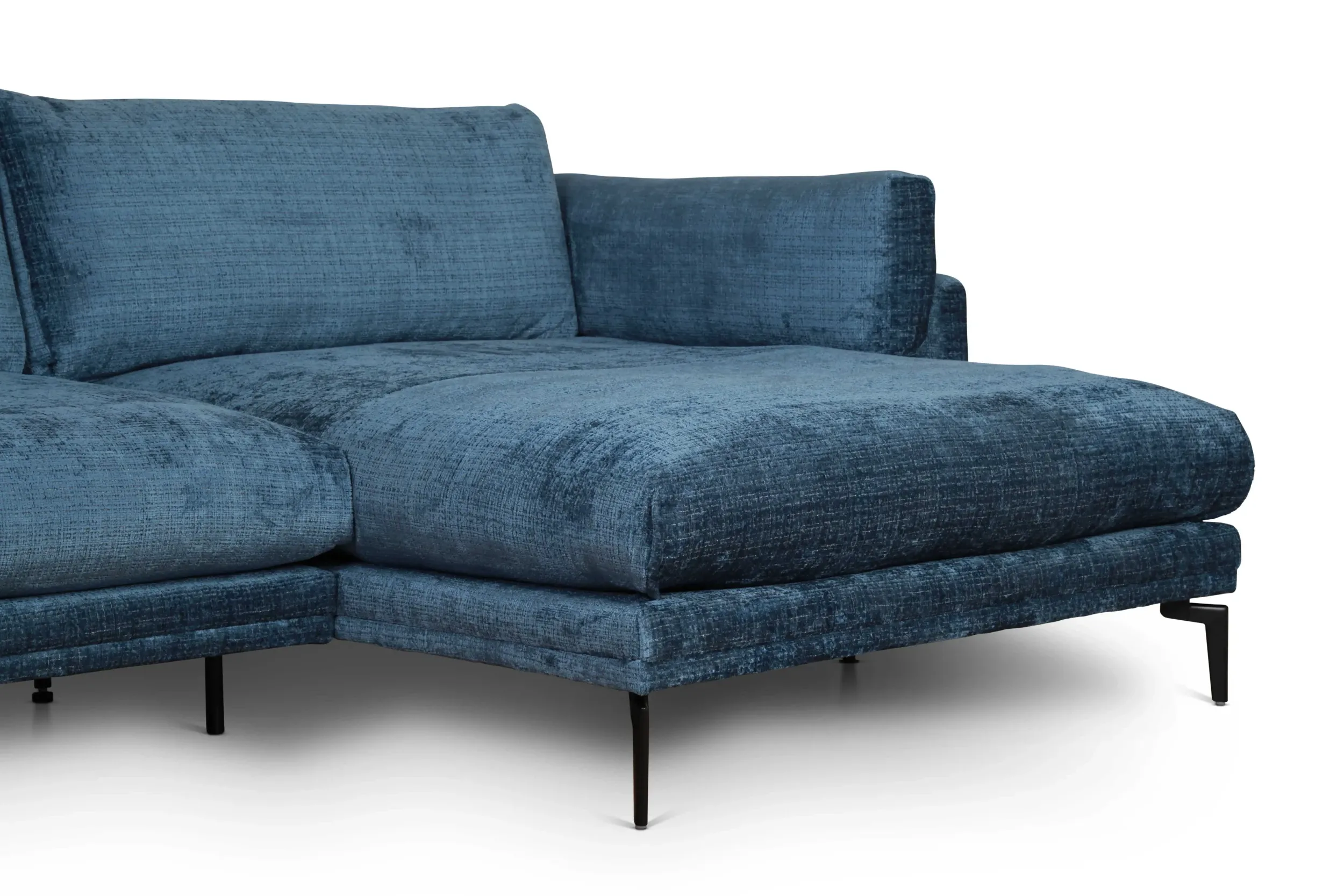 Eden nurgadiivan ühendab kaasaegse disaini ja luksusliku mugavuse. Lummav sinine sametise ilmega kangas lisab elutuppa iseloomu ja väärikust, samas kui õhuline vorm ning kõrged mustad metalljalad annavad diivanile kerge ja modernse ilme.